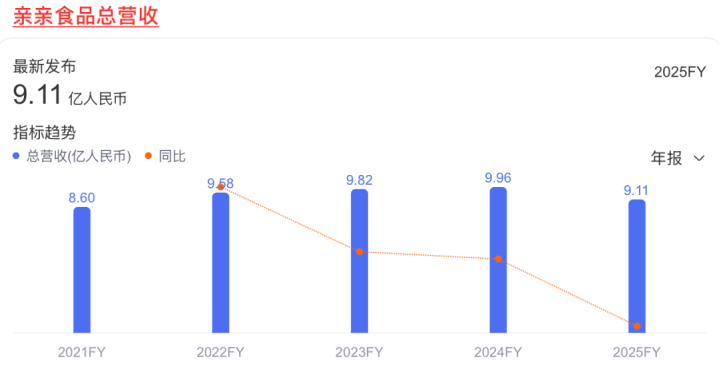 但财报涌现,2021年至2025年,亲亲食物的营收分别为8.6亿元、9.58亿元、9.82亿元、9.96亿元和9.11亿元,恒久未能重新艰涩10亿元大关。