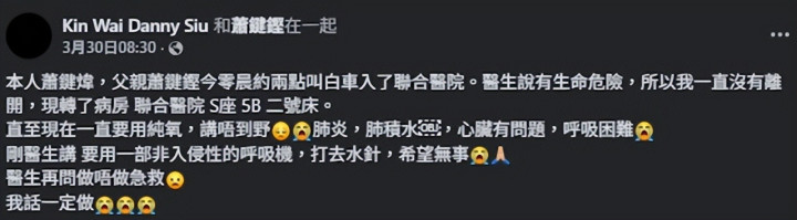 其子萧键炜曾在3月30日裸露,父亲凌晨住院,出现肺炎、肺积水、腹黑及呼吸问题,一直要用纯氧看护。