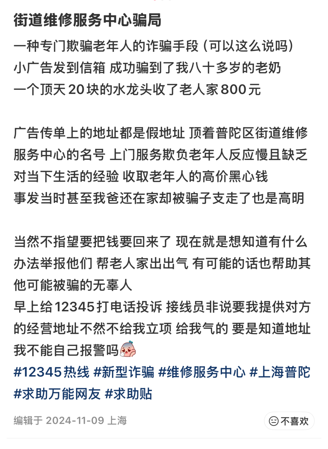 有市民称,家中80多岁老东谈主水龙头漏水,通过雷同卡片关系维修,被收取800元,而对方骨子资本应不及20元;也有网友提到,家中老东谈主被东谈主在维修油烟机时收取高额清洗费,且维修东谈主员刻意支开家中其他成员,单独向老东谈主施压收费。这些案例中,涉事方均使用相似的宣寄语术、临时涨价、拒开导票等手法,所留电话难以接通,地址虚假,显然属于有组织的诓骗算作。