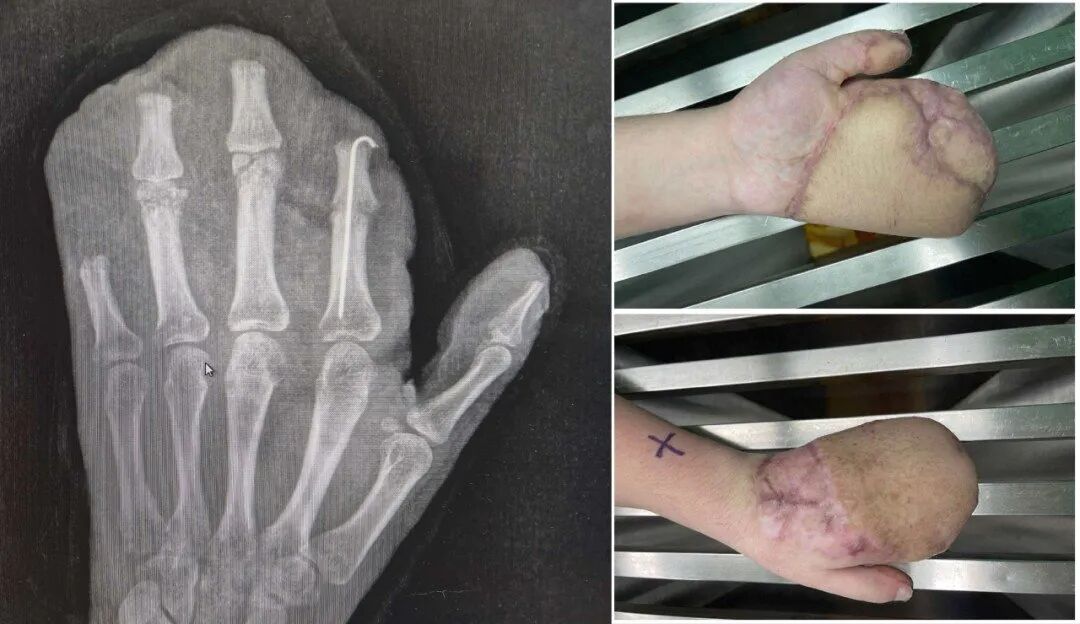 几个月前,24岁的工东说念主小王职责时,左手失慎被机器碾压,导致左手严重受伤,手掌、手背、各指掌侧及背侧皮肤脱套流血、难熬,被蹙迫送到东莞市横沥病院。