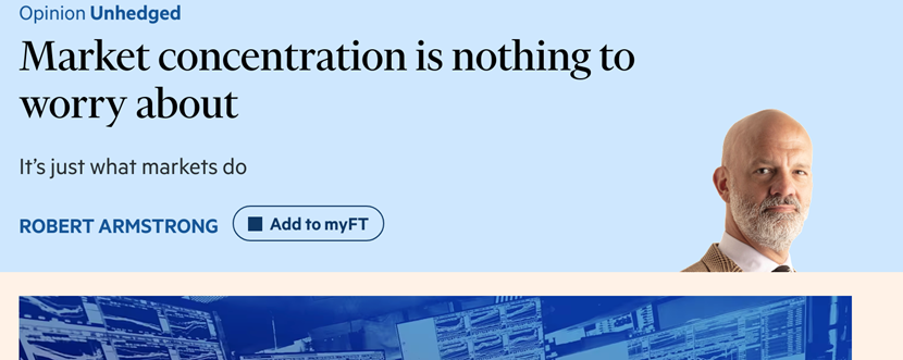 【各人网财经玄虚报谈】近日,英国Financial Times专栏作家Robert Armstrong发表深度著作,聚焦现时好意思股市集高度会聚于少数科技巨头的征象,考虑这一市集边幅是否意味着风险上升,并勾搭关连磋磨指出,市集合聚度本人并非风险中枢,高估值才是果真需要警惕的成分,且少数大公司主导市集实为本钱市集的常态。