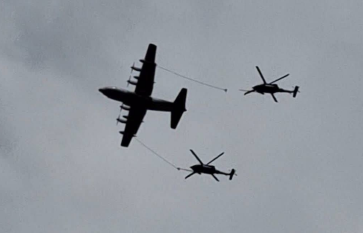 ▲好意思军加油机为两架进入挽救的“黑鹰”直升机加油据央视军事