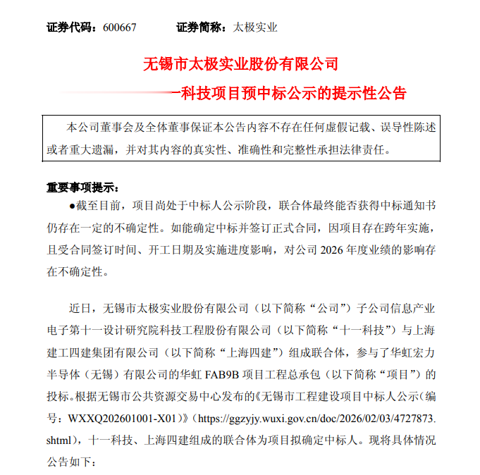 2月5日,太极实业发布公告,内容中默示,公司子公司信息产业电子第十一盘算参议院科技工程股份有限公司与上海建工四建集团有限公司(以下简称“上海四建”)构成荟萃体,参与了华虹宏力半导体(无锡)有限公司的华虹FAB9B面目工程总承包(以下简称“面目”)的投标。凭据无锡市人人资源交往中心发布的《无锡市工程缔造面目中标东说念主公示(编号:WXXQ202601001-X01)》,十一科技、上海四建构成的荟萃体为面目拟细则中标东说念主。