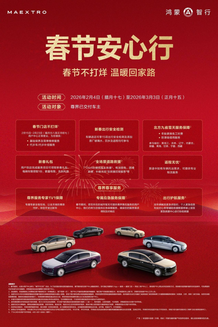 尊界S800不仅有OTA升级,针对春节还专门推出了春节坦然行举止,包含春节门店不打烊;新春出行安全检测;朔方九省雪天做事保险;新春礼包;全场景谈路调停和返程无忧,操办六项,让你春节用车更坦然。与此同期,还有三项尊界尊享做事,尊界做事众人1V1保险,众人全程在线,全天候的守护;专属救急做事保险,不管你身处何地,做事需求齐能得到实时反馈;出行护航做事,行车途中车辆触发伏击求援时,将会得到伏击调停。