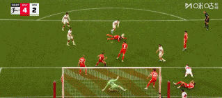 52’角球蹙迫中,戈雷茨卡射门被扑,替补出场的凯恩补命中的,拜仁4比1。
