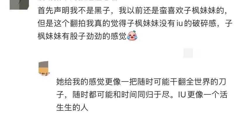 即使衣着松驰的衣服,发型亦然万年不变,不涂口红,没什么血色,很发奋的思要上演原版IU的幻灭感和无语感。