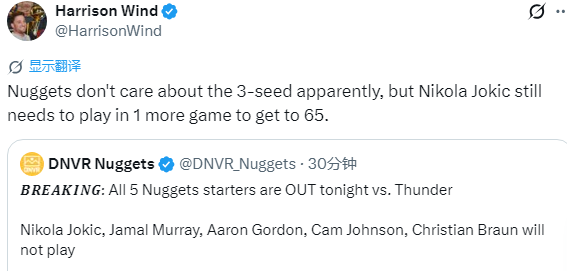 现在掘金、湖东说念主和火箭三队正在浓烈争夺西部第三,开云体育官网本日雷霆10东说念主缺战,掘金也轮休约基奇等5大主力,对此掘金记者Harrison Wind默示,掘金队彰着不在乎西部第三的位置,但尼古拉-约基奇仍然需要再打一场比赛智力达到65场评奖履历。