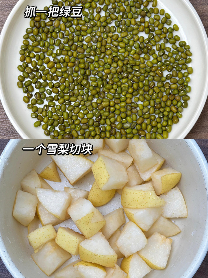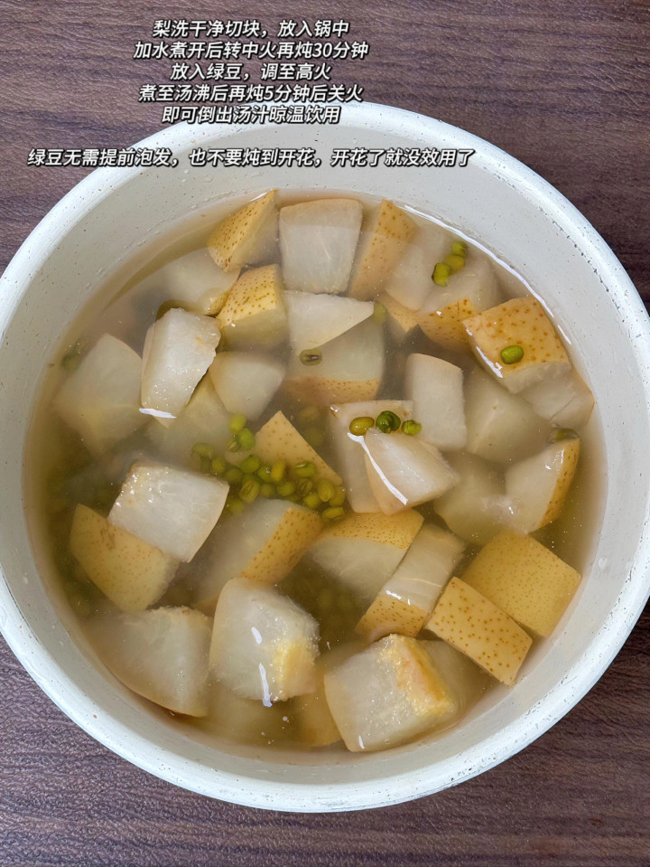 作念法上有个要害点,许多东说念主弄错。梨洗干净,无用去皮,径直切块扔锅里,加水煮开之后调成中火,渐渐炖上半小时,把梨的润性给炖出来。这本领再握一小把绿豆,洗干净无用泡,径直撒进锅里。把火调到最大,煮到汤再次欢欣起来,看着绿豆刚要被煮得裂开还没裂开的本领,连忙关火。前后或然就五六分钟。