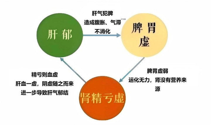 由此可见,肾虚了,其他脏腑也会随着遇害。相等是肝、脾,它们跟肾的关系可密切了。肝肾同源,不错说肾精亏虚会径直导致肝血失去濡养,进一步酿成肝气不舒而肝郁;肝气犯脾,又会导致脾胃出现一些运化无力的症状;脾虚则化不满血不及,无法补充肾里的精血,最终形成一套肝-肾-脾失调的恶性轮回。