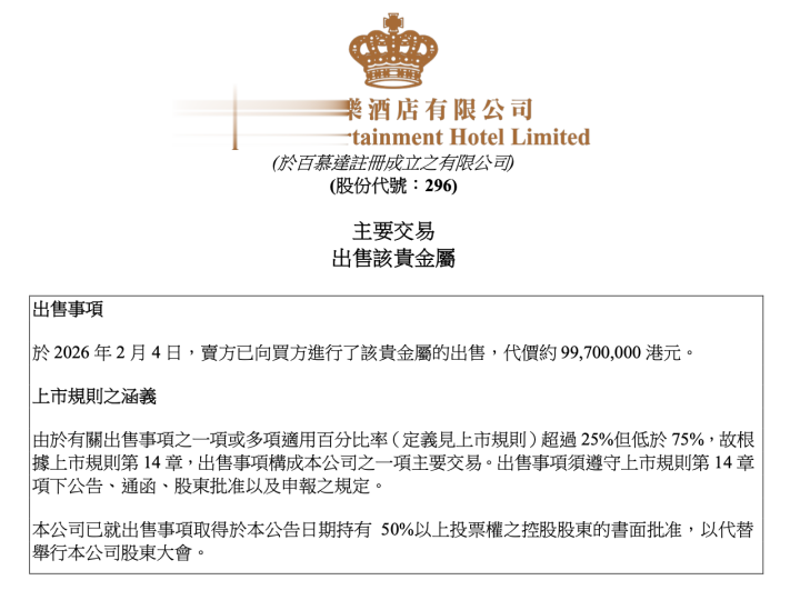 英皇文娱旅店称,在曩昔二十年来,为了于澳门英皇文娱旅店内的赌场营造豪侈明后的氛围以提高品牌形象,集团将多块金砖铺设在旅店大堂大地劝诱东谈主流。自圮绝博彩业务营运后,集团积极权术其他文娱及失业举止。鉴于相关区域拟进行革命及从头布局,金砖行为旅店原室内狡计及胪列的一部分,已不再与旅店将来主题相关。鉴于当前的商场景色以及该贵金属的商场价钱当今处于高位水平,董事以为出售事项对集团而言为细密无比契机,可完毕和开释该贵金属的价值,同期省俭相关保安及保障用度。