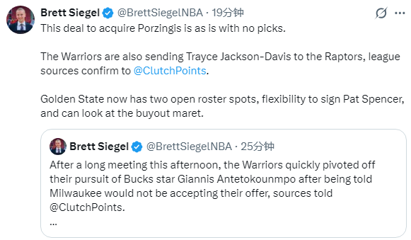 名记Siegel报谈,在今全国午开了永久的会议后,英豪快速转向了波津,因为雄鹿报告英豪,他们不会摄取他们对于字母哥的报价;该记者还默示,英豪可能诓骗这两个限额先转正斯潘塞,然后再对准往来扫尾日后的被买断的目田球员市集。
