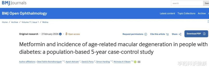 Romdhoniyyah DF, Alshukri A, Parry DG, Harding S, Beare NAV. Metformin and incidence of age-related macular degeneration in people with diabetes: a population-based 5-year case-control study. BMJ Open Ophthalmology. 2026;11:e002339.