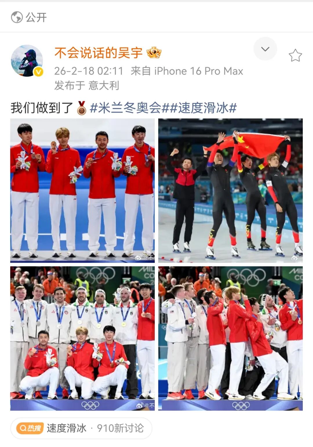 17日下昼,在2026年米兰冬奥会速率溜冰男人团体追赶B组决赛中,中国队以0.09秒的轻飘上风力克荷兰队,夺得铜牌。