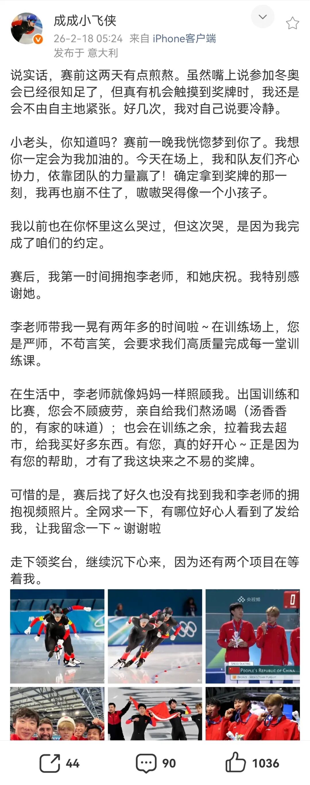 刘瀚彬发长文称:“说真话,赛前这两天有点煎熬。天然嘴上说投入冬奥会也曾很舒适了,但真有契机触摸到奖牌时,我照旧会不由自主地垂危。好几次,我对我方说要任性。……走下领奖台,继续千里下心来,因为还有两个技俩在等着我。”